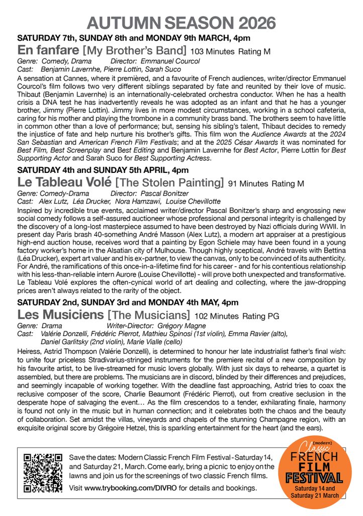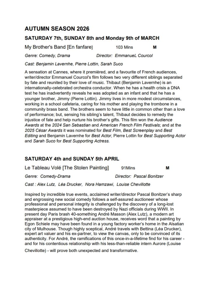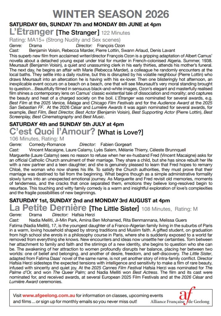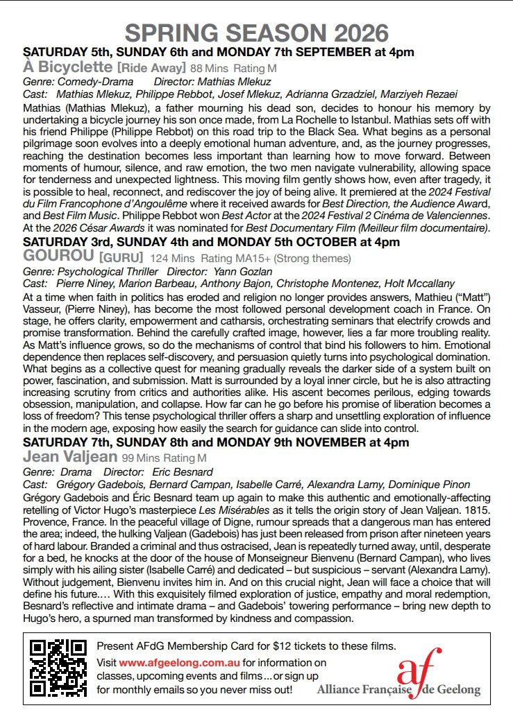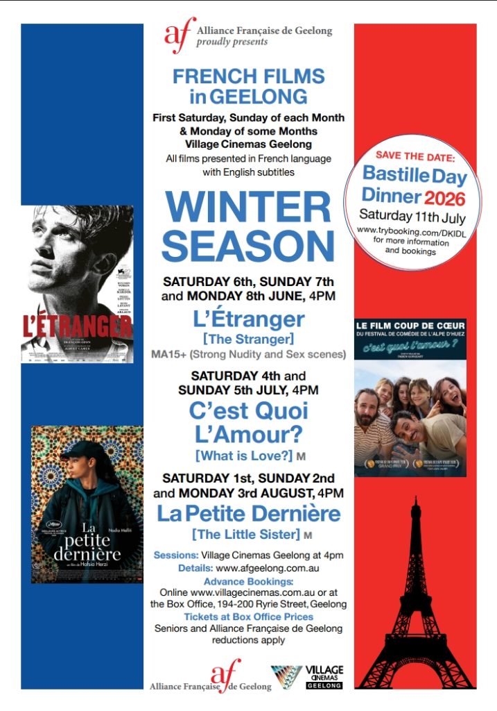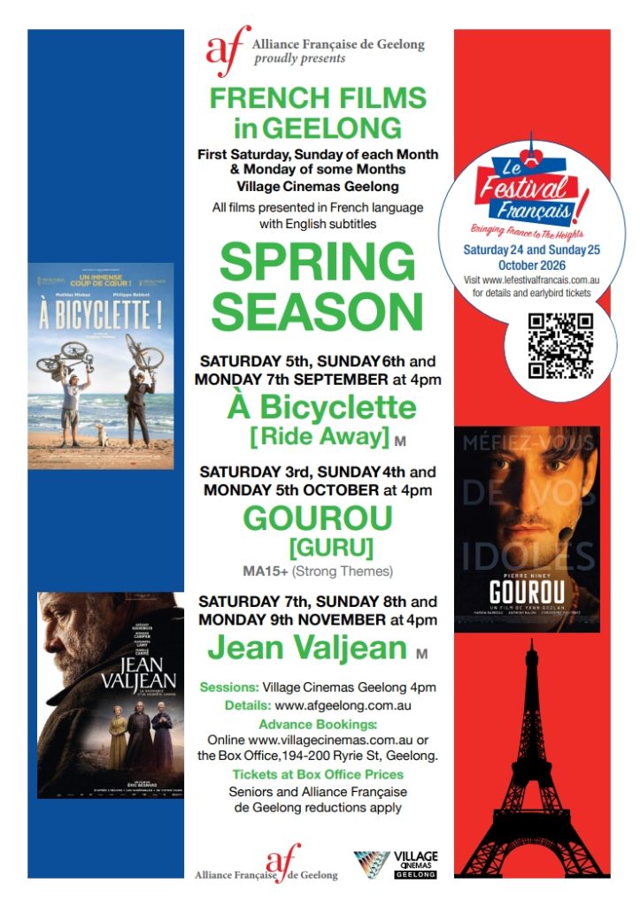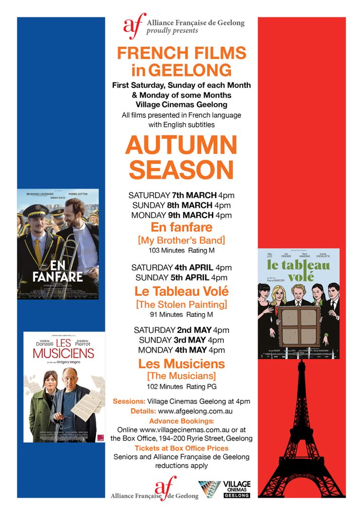The Alliance Française de Geelong has arranged to screen a range of French films in Geelong in conjunction with the Village Cinema in Ryrie Street, Geelong.