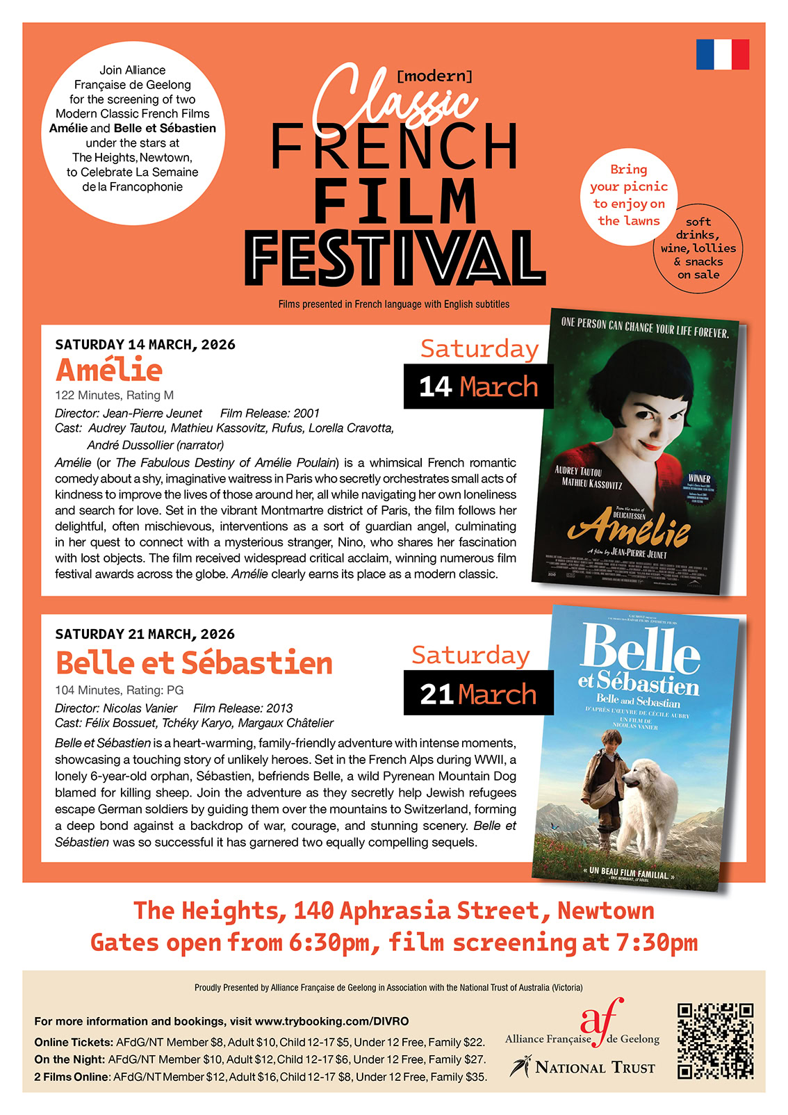 Join Alliance Française de Geelong for the screening of two Modern Classic French Films over consecutive Saturday evenings under the stars at The Heights, Newtown.